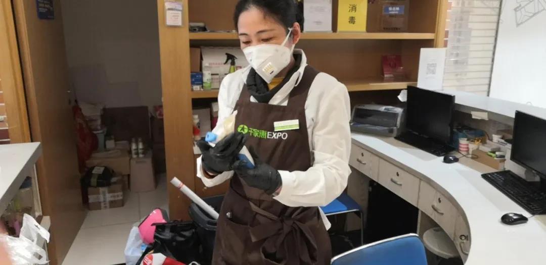 每天營業前、營業中和營業后,她和同事們都要使用消毒清潔劑在店內進行無死角殺菌消毒,對收銀臺、邊側扶手、手推車、手提籃、服務臺、寄包柜等高頻接觸的重點區域,更是要每2小時就要進行一次消殺工作。