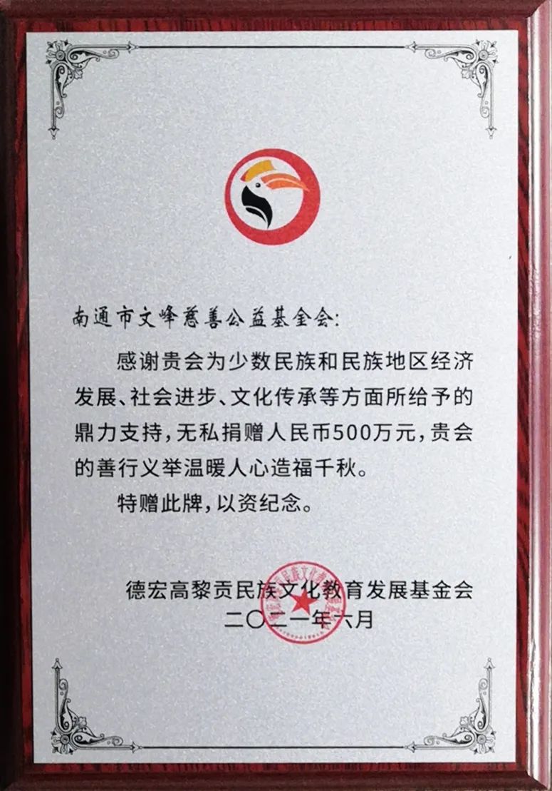 2021年9月,江蘇文峰集團榮獲“南通慈善獎”最具愛心捐贈企業稱號。