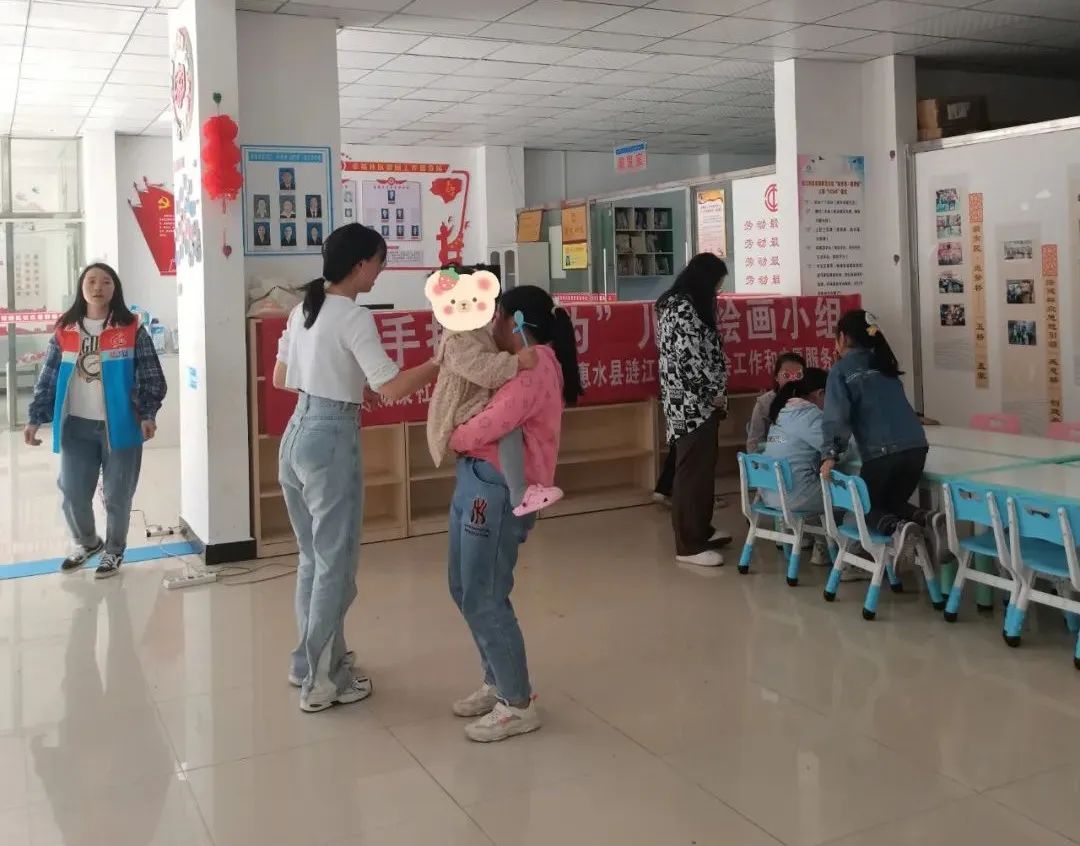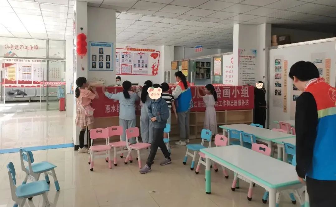 我們到達的惠水縣的那天有幸參觀了機構在搬遷社區為兒童開展的繪畫活動。一進門,提前等候的小朋友便跑過來圍住了社工,有的小朋友幫忙擺放桌椅布置場地,有的拉住社工說起自己的“小秘密”,還有的熟練地接過簽到表進行簽到。