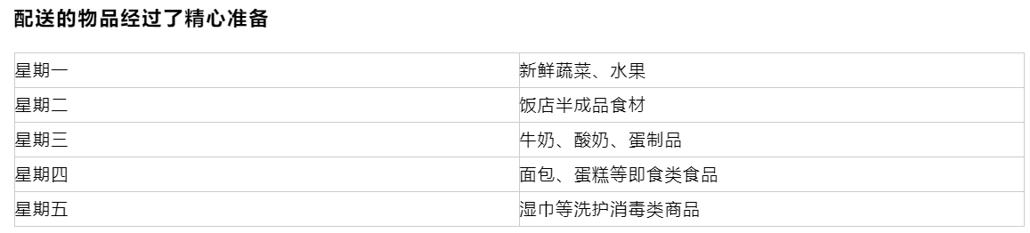按計劃,從2月3日開始,分別由文峰集團下屬的文峰千家惠、 文峰飯店和南通大飯店每天按品類配送食材。以五天為一個周期,連續配送4個星期,到2月28日配送完畢。