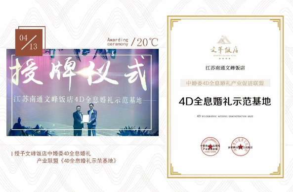 2019年4月,文峰飯店舉辦了《2019春季4D全息婚SHOW星光文化展》,南通市原副市長、旅游協會會長朱晉;南通市委宣傳部文化改革發展處處長顧凡;南通市商務局副局長楊丁勇等領導出席了活動,中婚委4D全息婚禮產業聯盟授予文峰飯店《4D全息婚禮示范基地》。